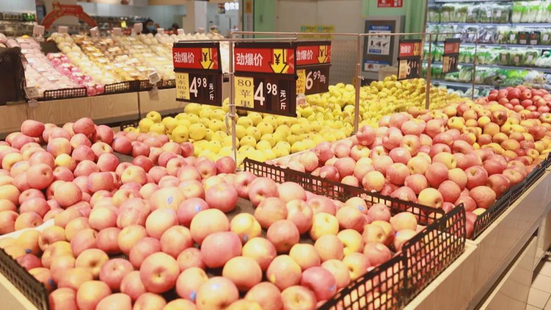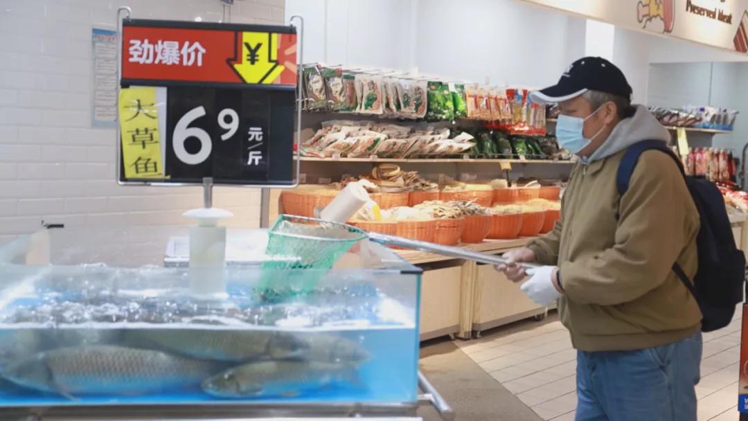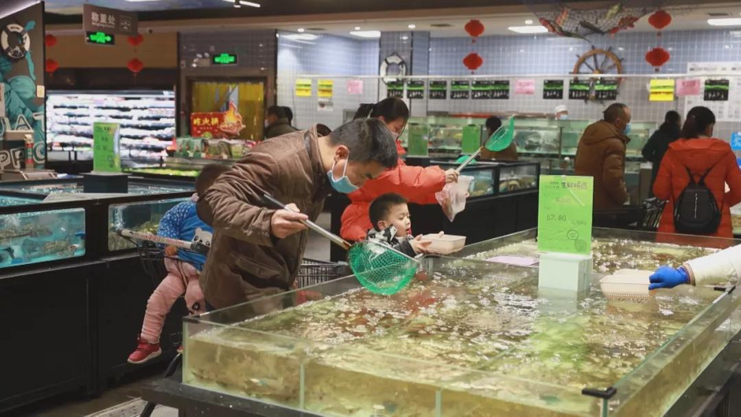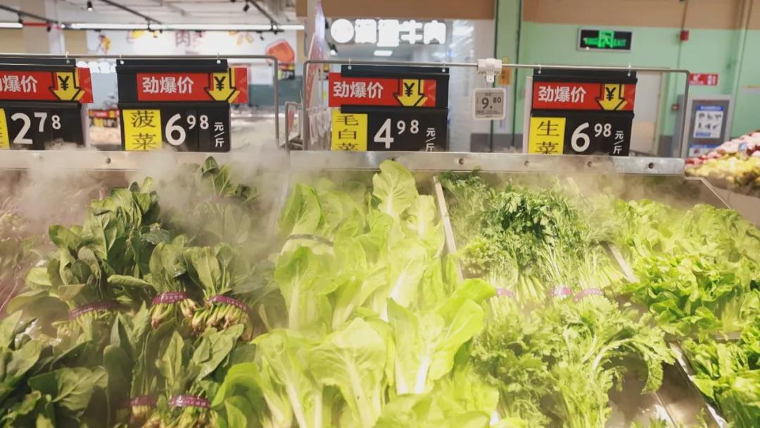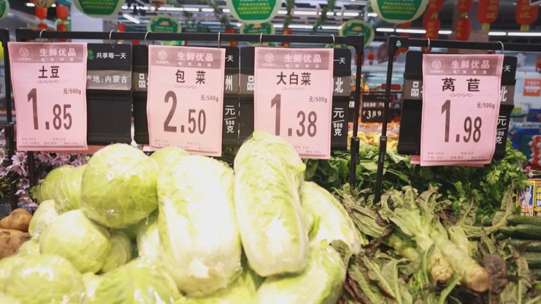 在生鲜区,各类蔬菜、水果一应俱全,肉、禽、蛋、菜、粮、油供应充足。