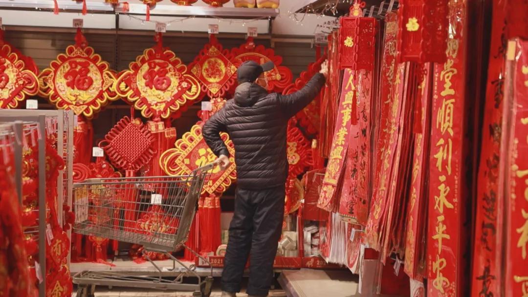 虽然是就地过年,但年味不能减。各大商超在醒目处张贴春联、喜字、各式吉祥物装饰,高高挂起的大红灯笼显得年味十足。