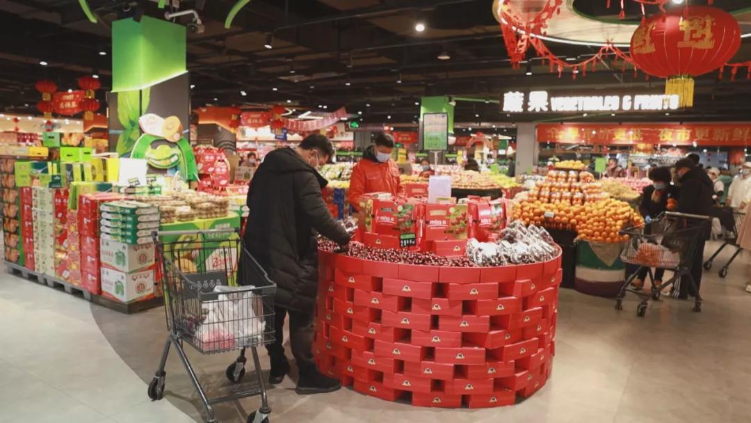 在沃尔玛超市,记者看到,工作人员正忙着将一箱箱商品上架补货,各类年货琳琅满目,前来购物的顾客络绎不绝。