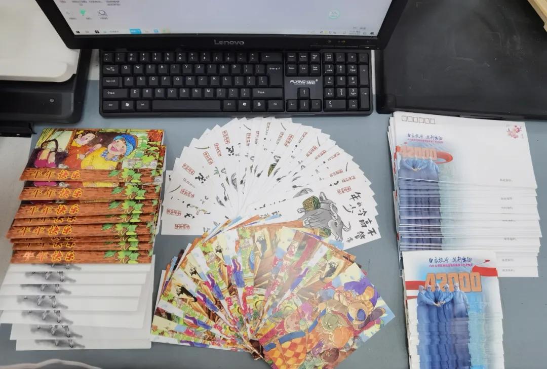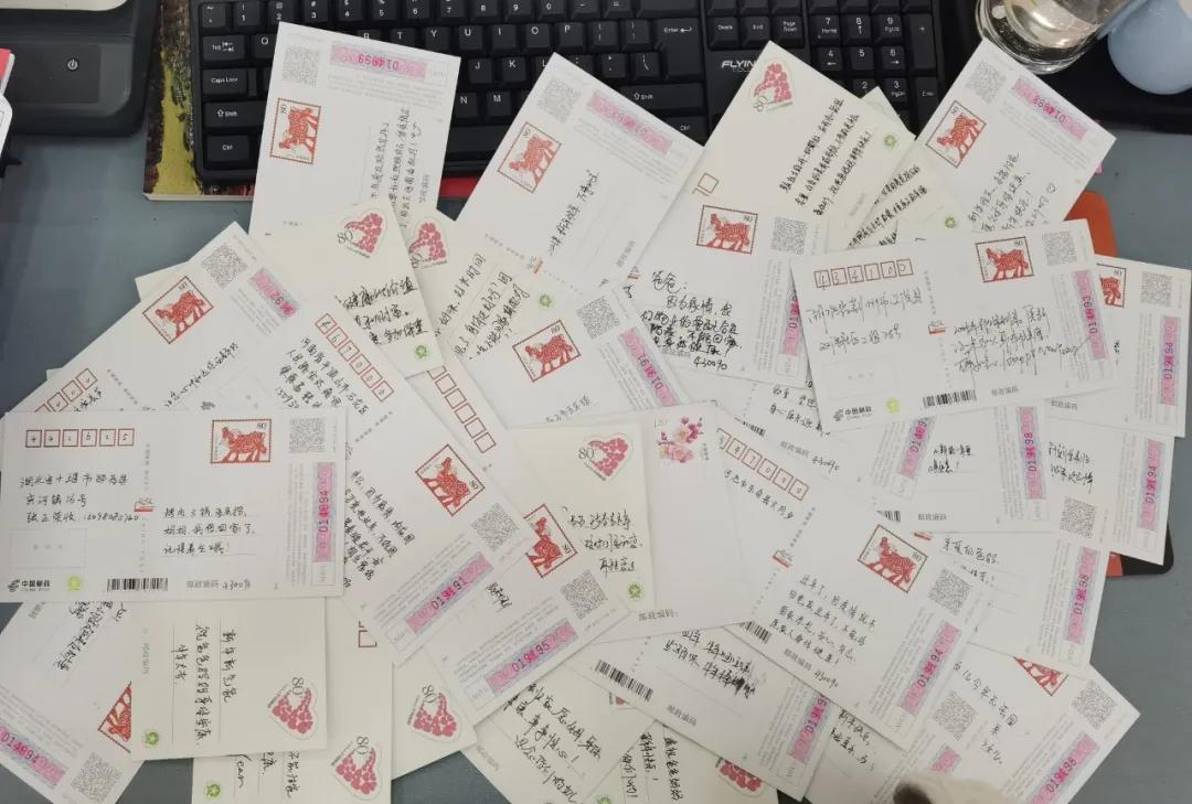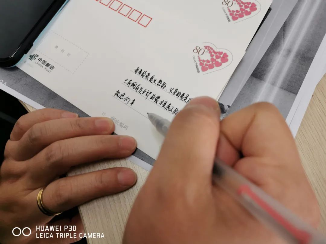 社区工作人员将这些充满纪念意义的明信片送给外地居民,等到他们写好后,再由社区新时代文明实践站“红色联盟”党员志愿者帮忙送去快递。