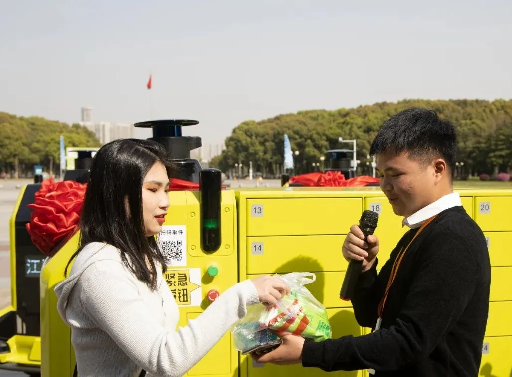 江汉大学学生胡朝在学校图书馆前操场,掏出手机预约取件,5分钟左右,一辆绿色的无人物流车便行驶到他的面前,扫码、开柜、取件,仅用10秒。