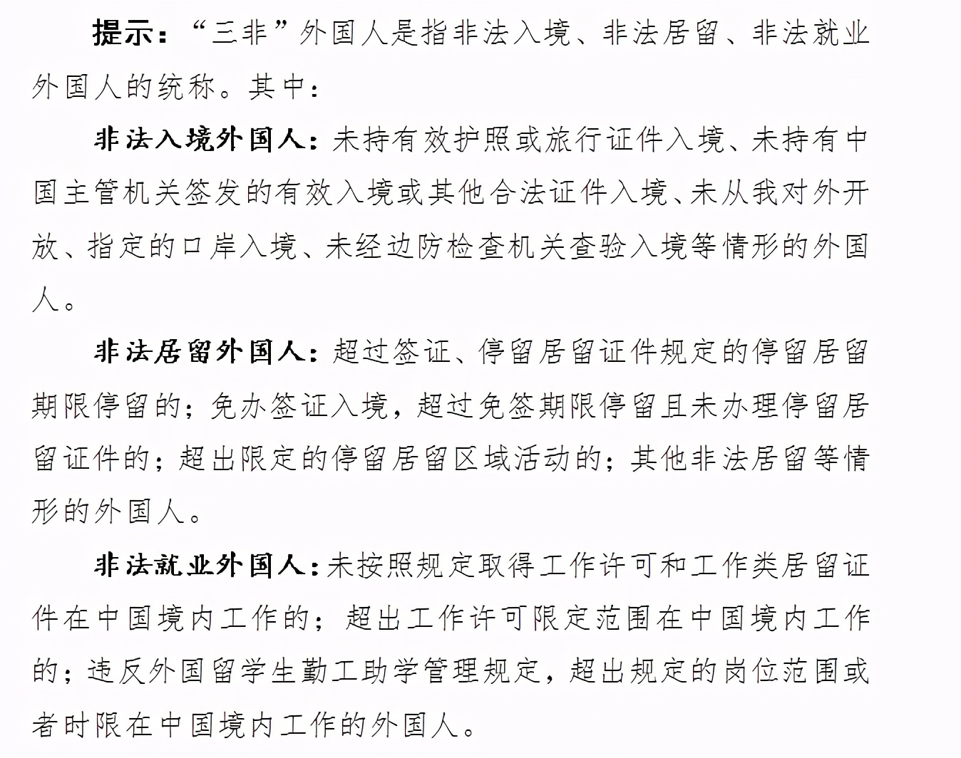 所谓“三非”是指外国人非法入境、非法居留、非法就业。外国人“三非”活动线索包括:策划、准备实施、实施组织、运送外国人偷越国(边)境的;协助外国人非法出境入境的;外国人存在非法入境、非法居留、非法就业等“三非”情形的;容留、藏匿非法入境、非法居留的外国人,协助非法入境、非法居留的外国人逃避检查,或者为非法居留的外国人违法提供出境入境证件的;介绍外国人非法就业、非法聘用外国人的;其他涉嫌外国人偷越国(边)境及外国人“三非”违法犯罪活动的线索。