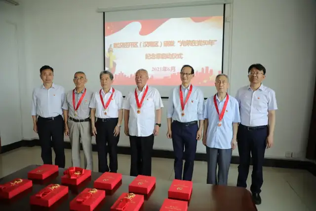 6月9日,武汉经开区(汉南区)颁发“光荣在党50年”纪念章启动仪式在沌阳街道举行,首批10名老党员代表获颁“光荣在党50年”纪念章。按照中央和省市安排部署,我区将分批向符合条件的党员颁发纪念章。区领导何裕生出席启动仪式并为老党员颁发纪念章。