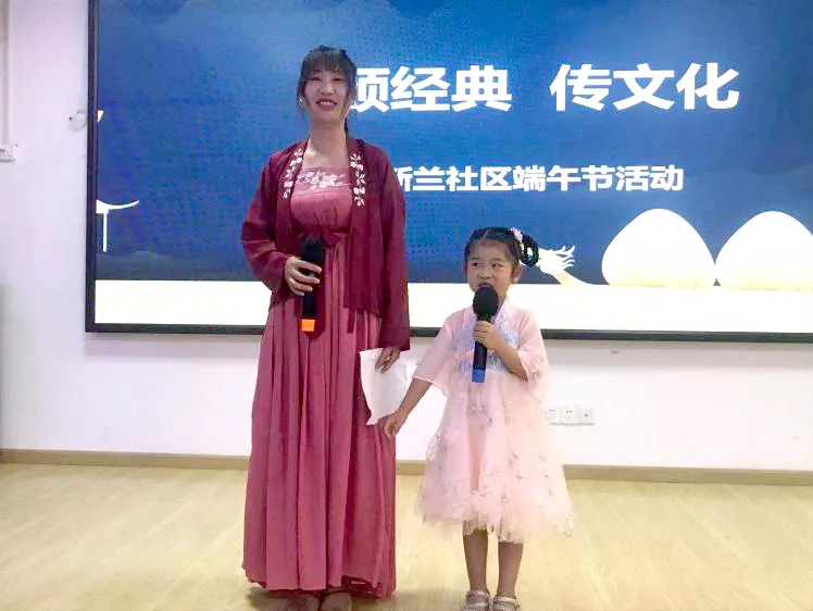 “路漫漫其修远兮,吾将上下而求索……”朗朗童声从社区活动室传来,原来是新兰社区亲子家庭张妍汐小朋友和妈妈吴洁一起身着汉服在讲述端午节的来历、习俗以及爱国诗人屈原的故事,稚嫩的童声带领大家用纯净的心灵去感受古典诗文的意境。