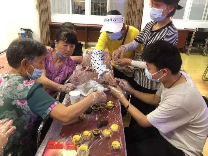 揉绿豆酥、压模成型,根据自己的喜好添加馅料,相互探讨着制作技巧,虽然是第一次制作,但是大家做得有模有样。半小时后,香气扑鼻的绿豆糕成型了,看着各自的“作品”,大家满是成就感。这些满载深情厚谊的绿豆糕将通过社区党组织送到辖区内困难家庭和孤寡老人手中。