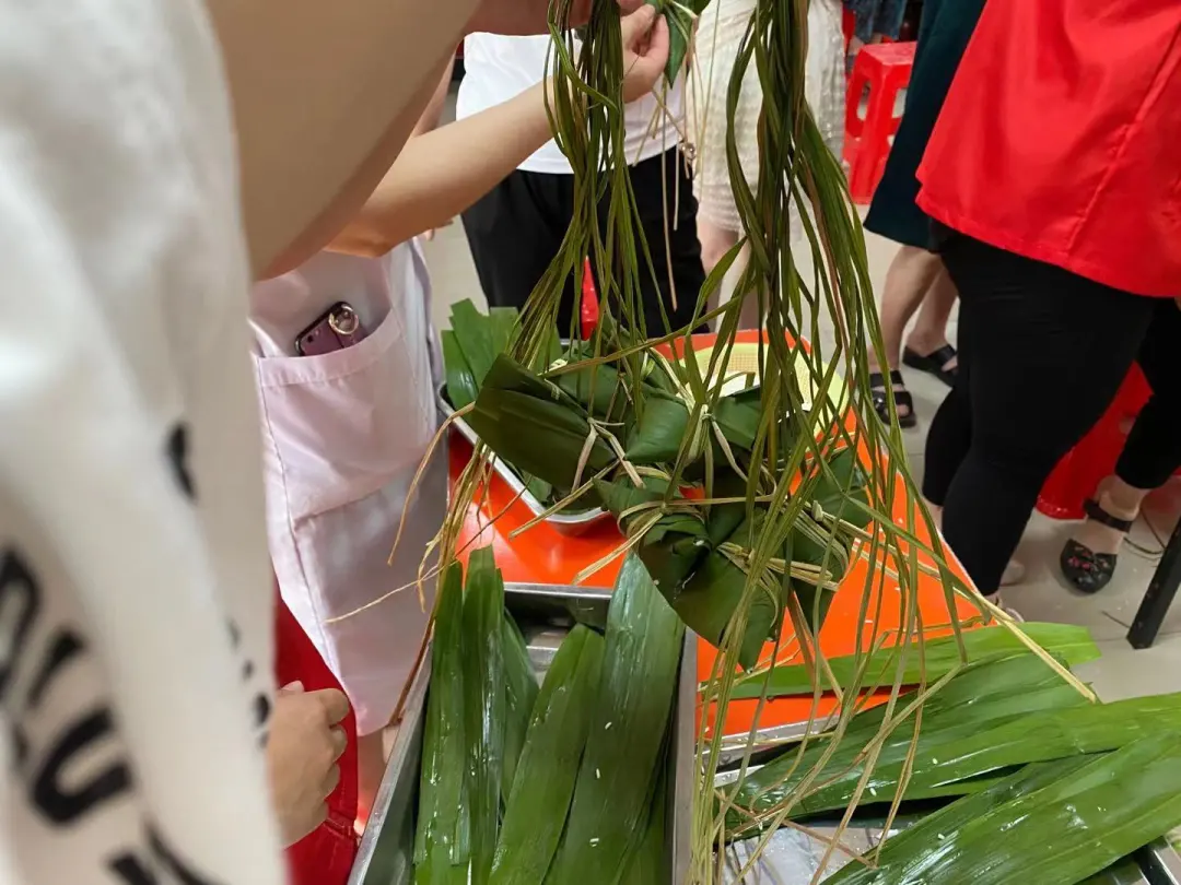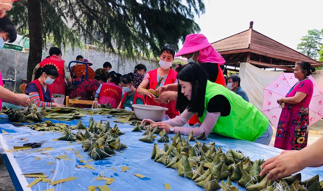 上午10点,党员志愿者们和社区居民群众男女老少齐上阵,大家各显神通,卷筒、填料、压实、折叶、扎绳、成型……片片清香粽叶、粒粒雪白糯米、阵阵飘香调料,在一双双巧手的协作下,组合成了一个个粽香袭人的粽子。