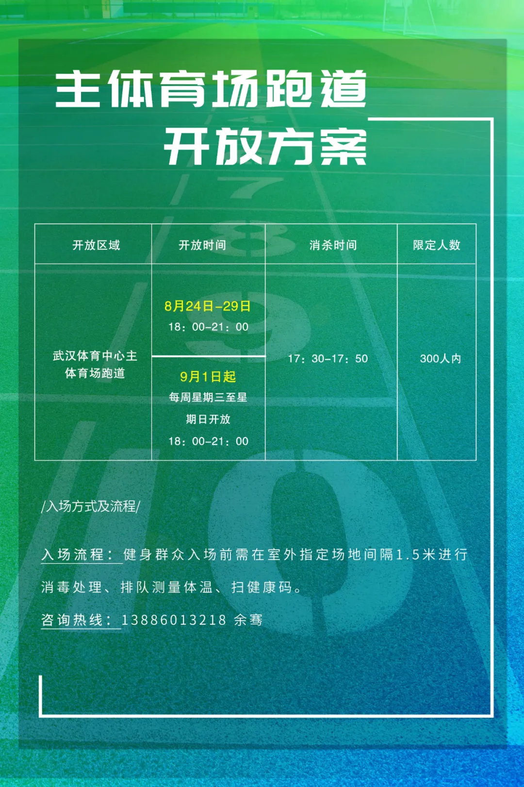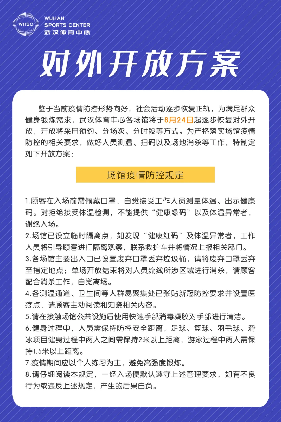 为满足群众健身锻炼需求,并严格落实疫情防控要求,武汉体育中心各场馆将采取预约、分场次、分时段的方式开放,馆内按照防控要求,已全程消毒,请前来健身的市民佩戴口罩,主动出示健康码,自觉接受体温检测,保持安全距离。