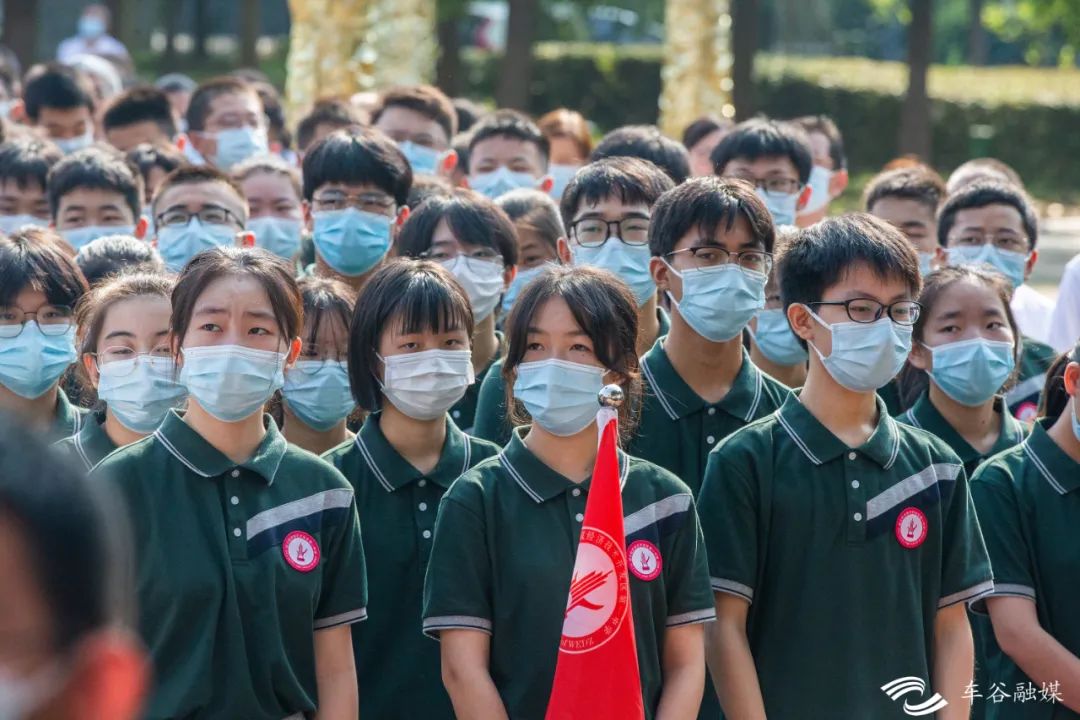 “全体学生、教职工在圆形广场集合!”今早8点25分,武汉经开区一中举行2021年秋季开学典礼。绿色、红色、蓝色三个方阵分别代表高中三个年级,同学们依次列队进入典礼现场。
