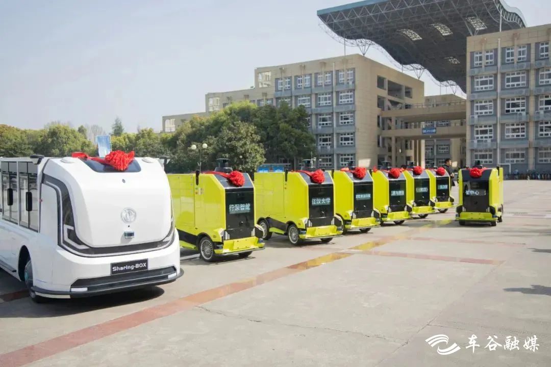 ▲无人驾驶售货车、物流配送车驶进江汉大学,为师生提供无人售卖、物流配送服务。