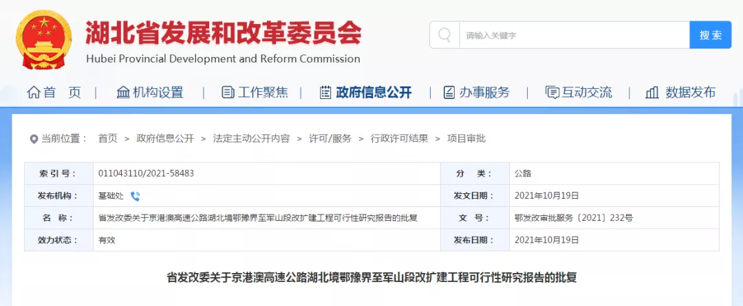 近期,湖北省交通运输厅发布了《省发改委关于京港澳高速公路湖北境鄂豫界至军山段改扩建工程可行性研究报告的批复》。