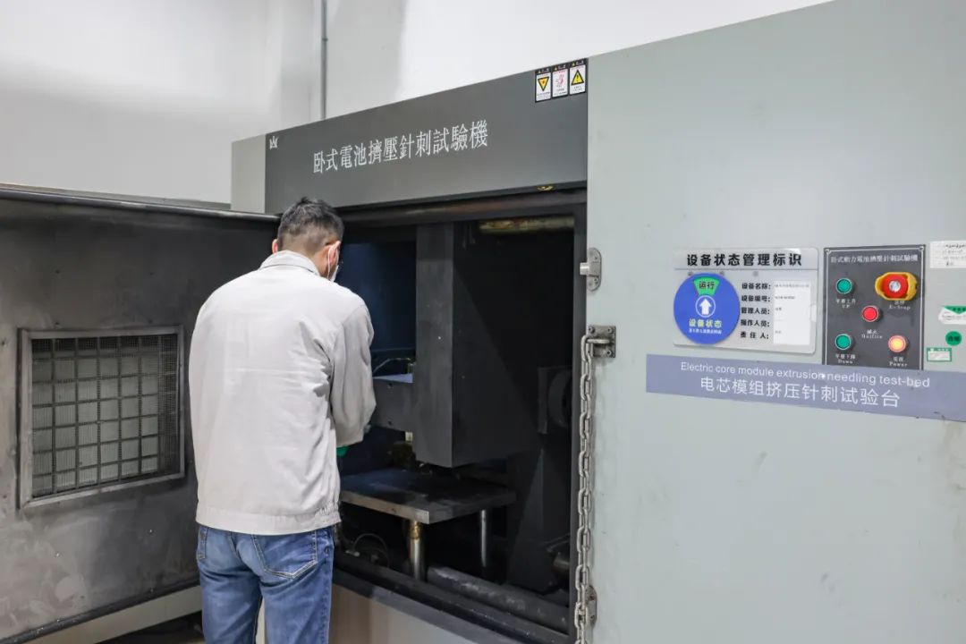 在电池挤压针刺试验间,直径约6毫米的一根钢针,刺向一块构成电池包的单电芯。挤压针刺试验,模拟电池受到挤压或冲击时是否会起火、燃烧,用于检测电池的安全性能。