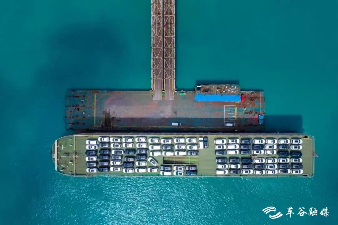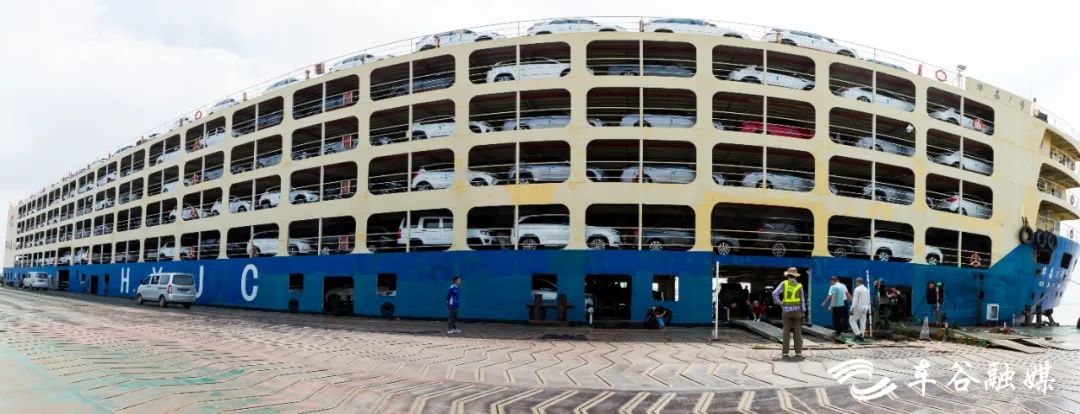 在江盛汽车滚装码头,一辆辆崭新的商品车从仓储库场驶入滚装船,即将走水路运往全国各地。