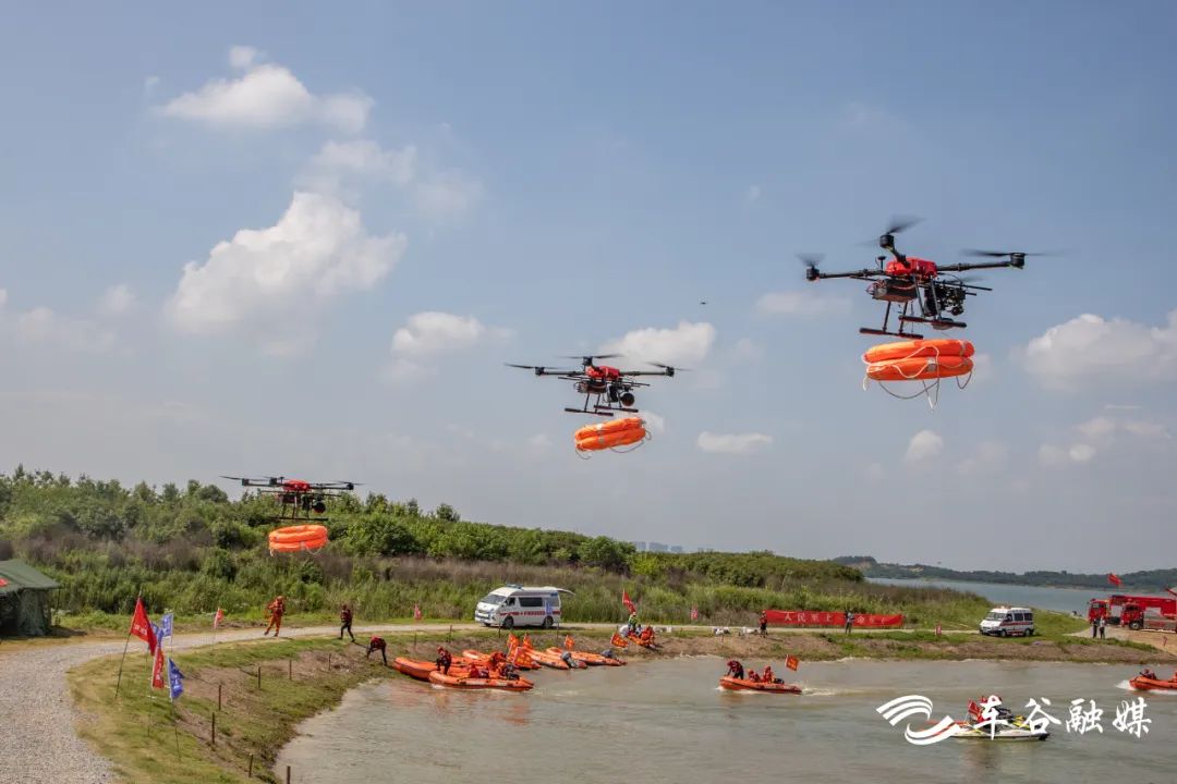 天空中,携带专业测绘仪器的工业级无人机,快速达到指定地点侦查灾情,还可精准地将救生圈定点投送到落水者的头顶。
