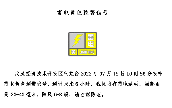 今天上午10时56分,武汉经开区气象台发布雷电黄色预警信号:预计未来6小时,我区将有雷电活动,局部雨量20-40毫米,阵风6-8级,请广大市民注意防范!
