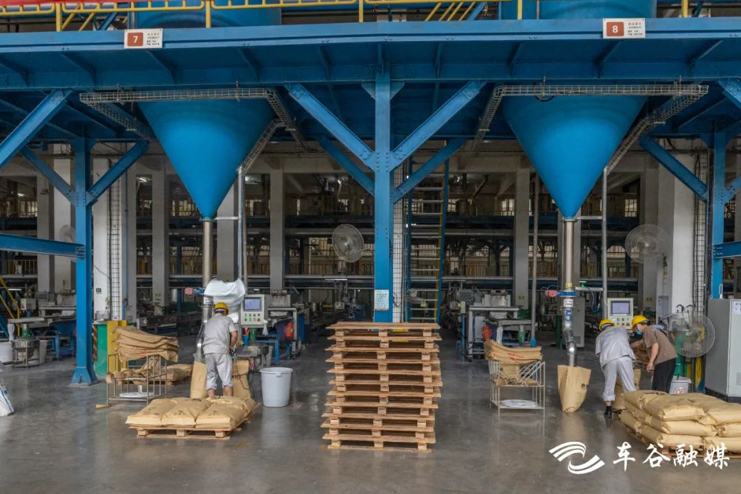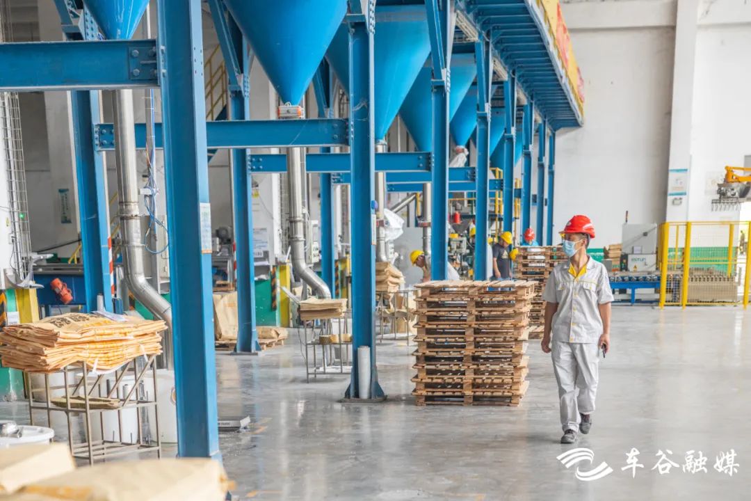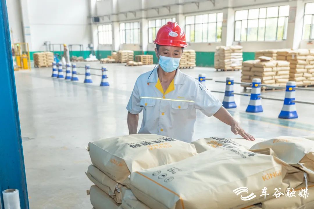 V3号工厂内,20条自动化生产线开足马力满负荷运转,一袋袋改性塑料经过装袋、称重、码包等程序后,运送库房等待发货,安全员陈友胜来回不间断巡查,发现问题立即要求改正。