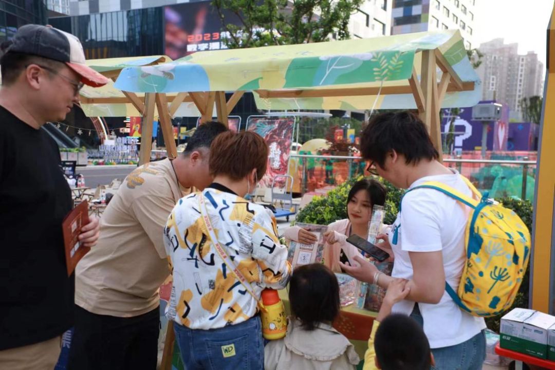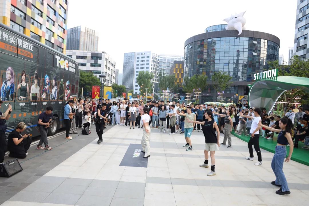 活动现场气氛热烈,游戏迷和国潮文化爱好者聚集在一起,感受科技与传统文化碰撞的魅力。现场观众对园区特有的粉色斑马线、魔方大楼、山海神兽等元素赞叹不已,纷纷打卡拍照。