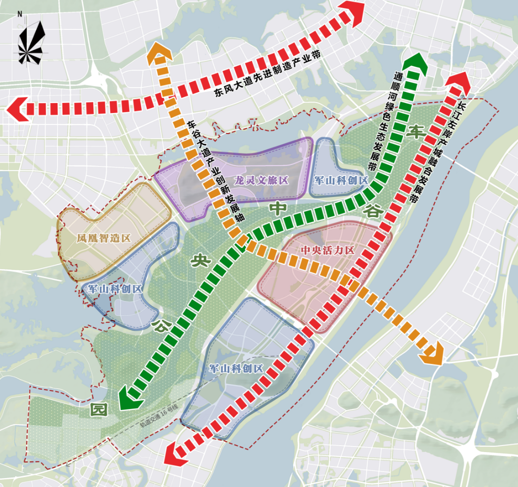 定空间——打造车谷大道产业创新发展轴、长江左岸产城融合发展带、通顺河绿色生态发展带,军山科创区、凤凰智造区、中央活力区、龙灵文旅区的“一轴两带多组团”空间发展新格局。