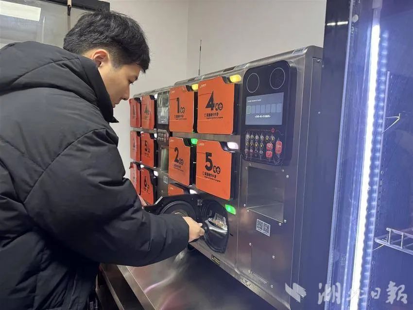 12月27日,在武汉迈森豪公司食堂内,记者见到了这套“聪明”的做菜机器。它外形仿佛一台小型快递柜,共有6个仓门。操作人员拿来一盒搭配好的净菜,在设备右上角处扫码,一个小仓门立刻弹出。把餐盒放入并关上仓门,设备就开始自动工作。3分钟,仓门再次弹开,一道热气腾腾的攸县香干便制作完毕。标准化操作,全程无明火、零排放。