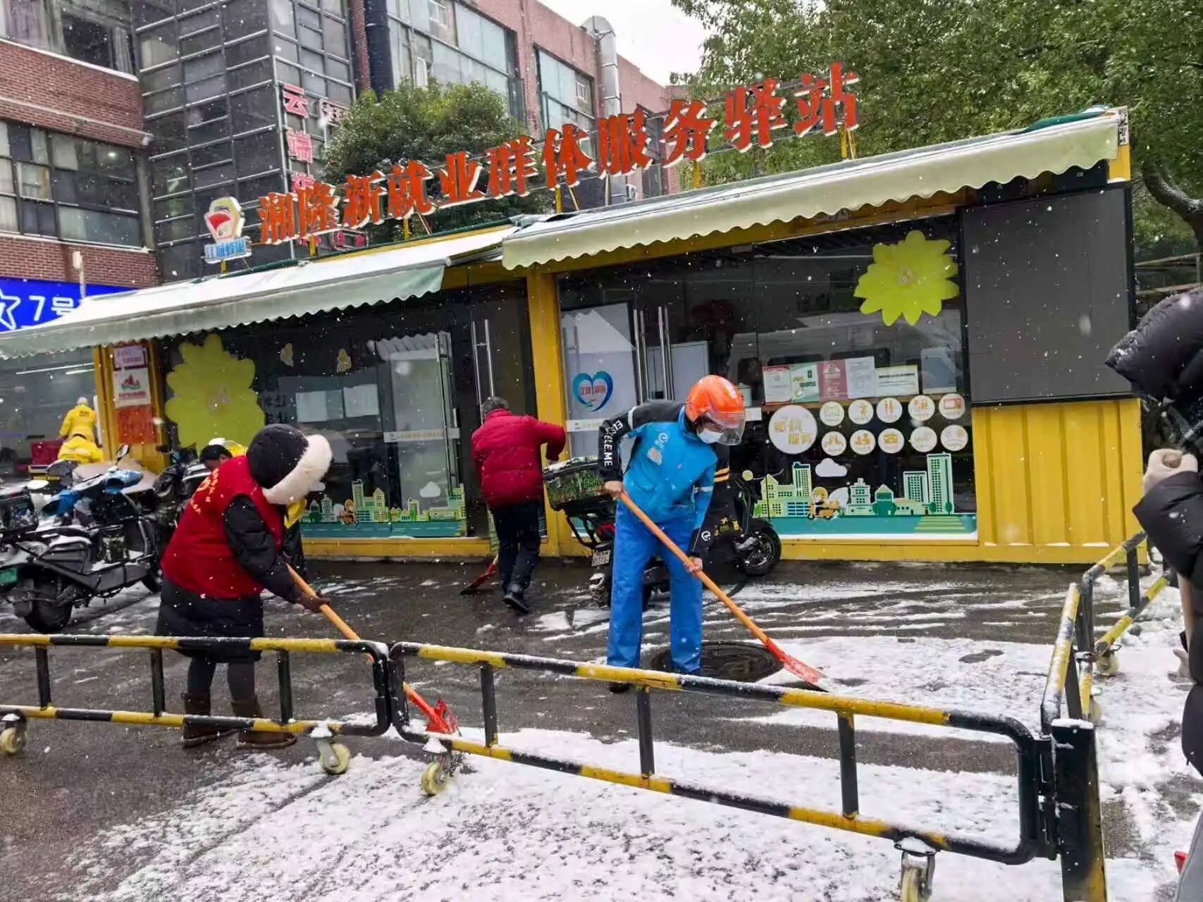 这样的暖心场景,遍布武汉经开区各个社区。沌口街翡翠玖玺社区的党员外卖员翟公岭、陈涛,在完成配送工作的间隙,也积极加入万达金街与社区的扫雪队伍,并提前打开驿站暖气,为往来歇脚的户外工作者送上暖意;沌阳街薛峰社区在社区党群服务中心、幸福食堂等点位设立“暖心服务站”,社区志愿者提前熬制驱寒姜茶,免费为过往居民、户外工作者、除雪作业人员提供热水、姜茶;湘口街绿荫路社区网格员蔡梦羽走访辖区五保户陈世贵,细致询问老人生活需求与身体状况,还贴心为老人代买生活物资,确保老人雨雪天生活无忧。