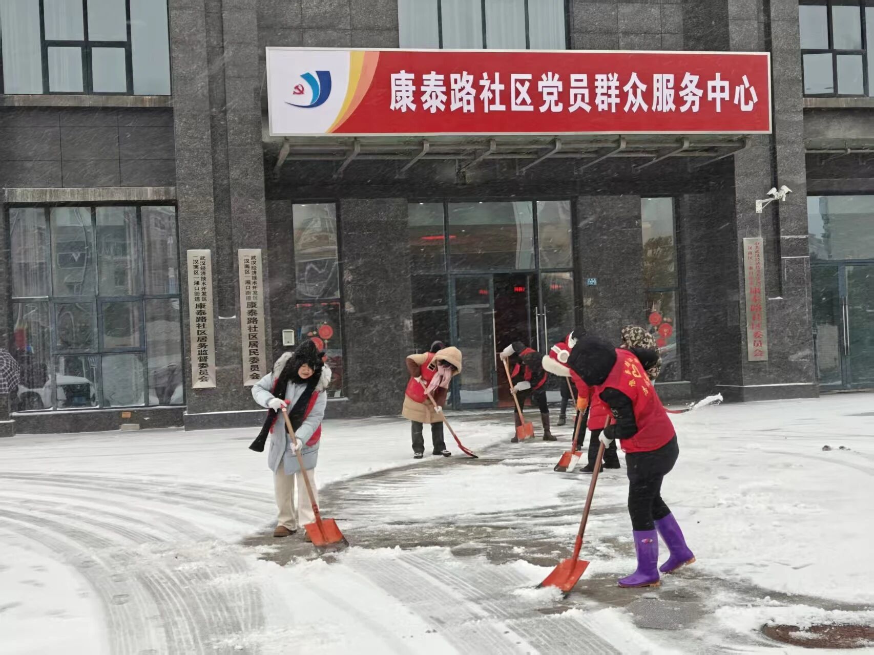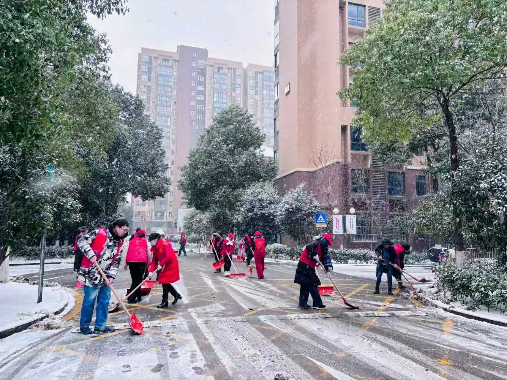 面对低温雨雪天气,武汉经开区及时发布《致全体车谷人的扫雪除冰倡议书》,各街道、社区积极组织党员干部、志愿者,对公交站台、地铁口、有轨电车站、公厕及人行天桥等人员密集、易结冰区域,开展人工除雪、撒盐作业,全力保障市民出行安全与畅通。