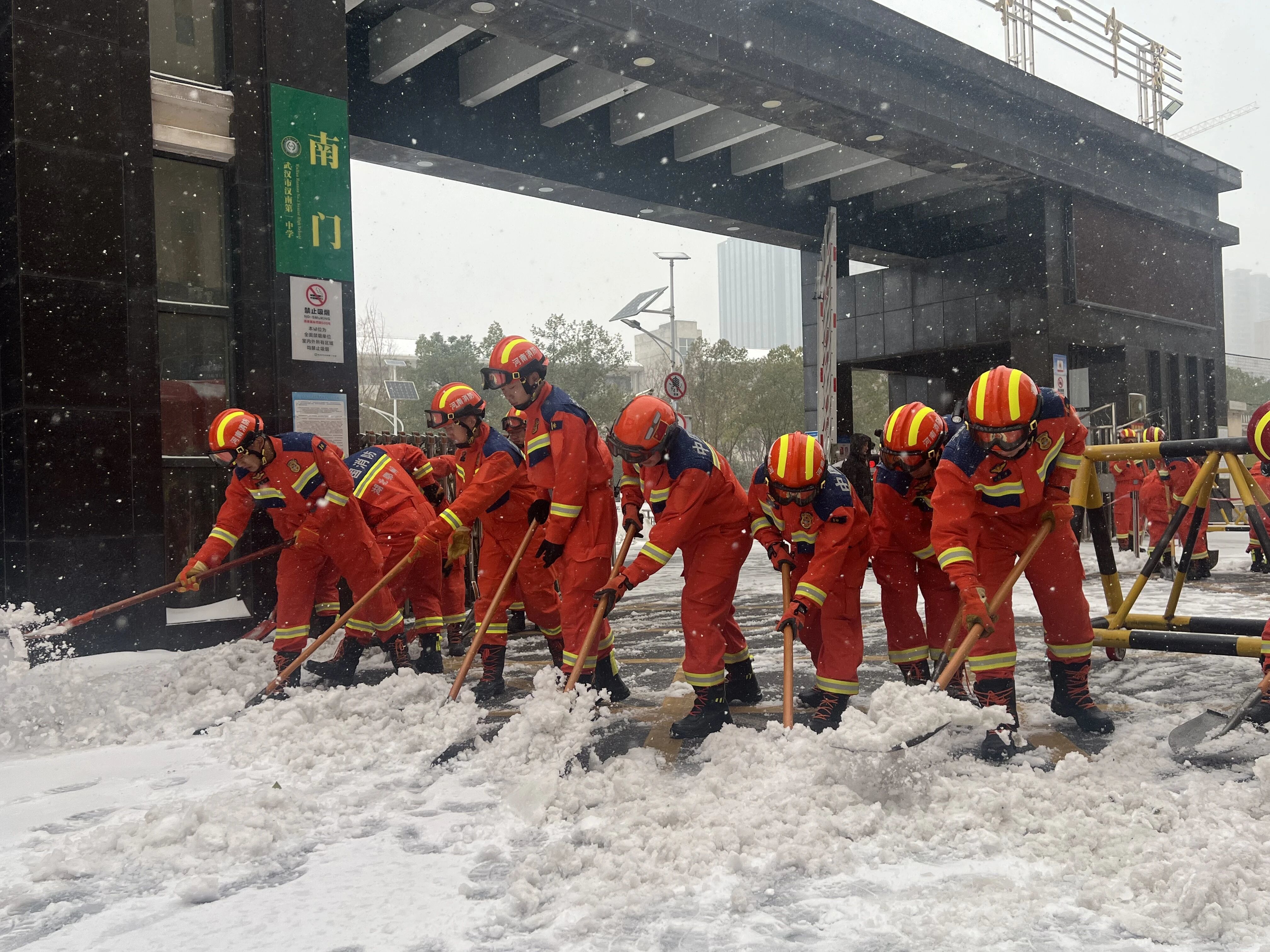 为应对极端天气,区应急局统筹救援力量,提前调度部署华中应急救援中心近千名队员、区消防救援局100余人的队伍,对医院、校园、大型商超等重点民生场所,持续开展铲雪除冰攻坚,全力保障城市有序运转。