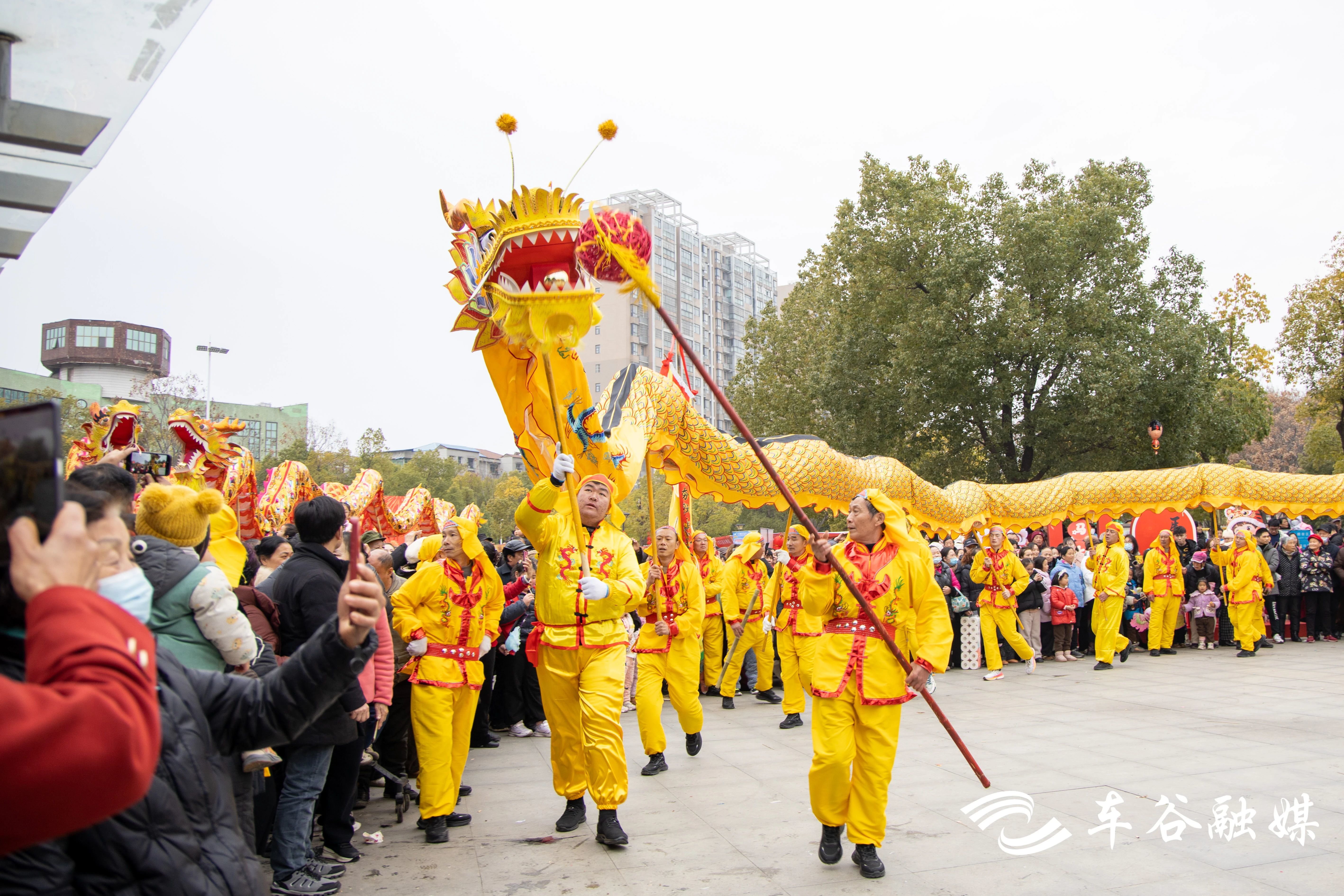 下午2点,演出尚未开始,纱帽广场上已聚集千余名市民。伴随着一阵激昂的锣鼓声骤然响起,两条十余米长的彩龙腾空而出,引得不少市民从龙身下钻过,讨个“穿龙身、沾龙气”的好彩头。