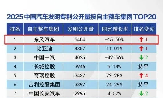 发明专利授权量3442件、公开量5404件,双双位列中国自主整车集团第一;智能网联领域有效专利2049件,同样排名第一。近日,中汽信息科技有限公司(以下简称“中汽信科”)发布的《2025年中国汽车专利数据统计研究报告》显示,东风汽车连续第四年在发明专利授权量上保持行业领先。