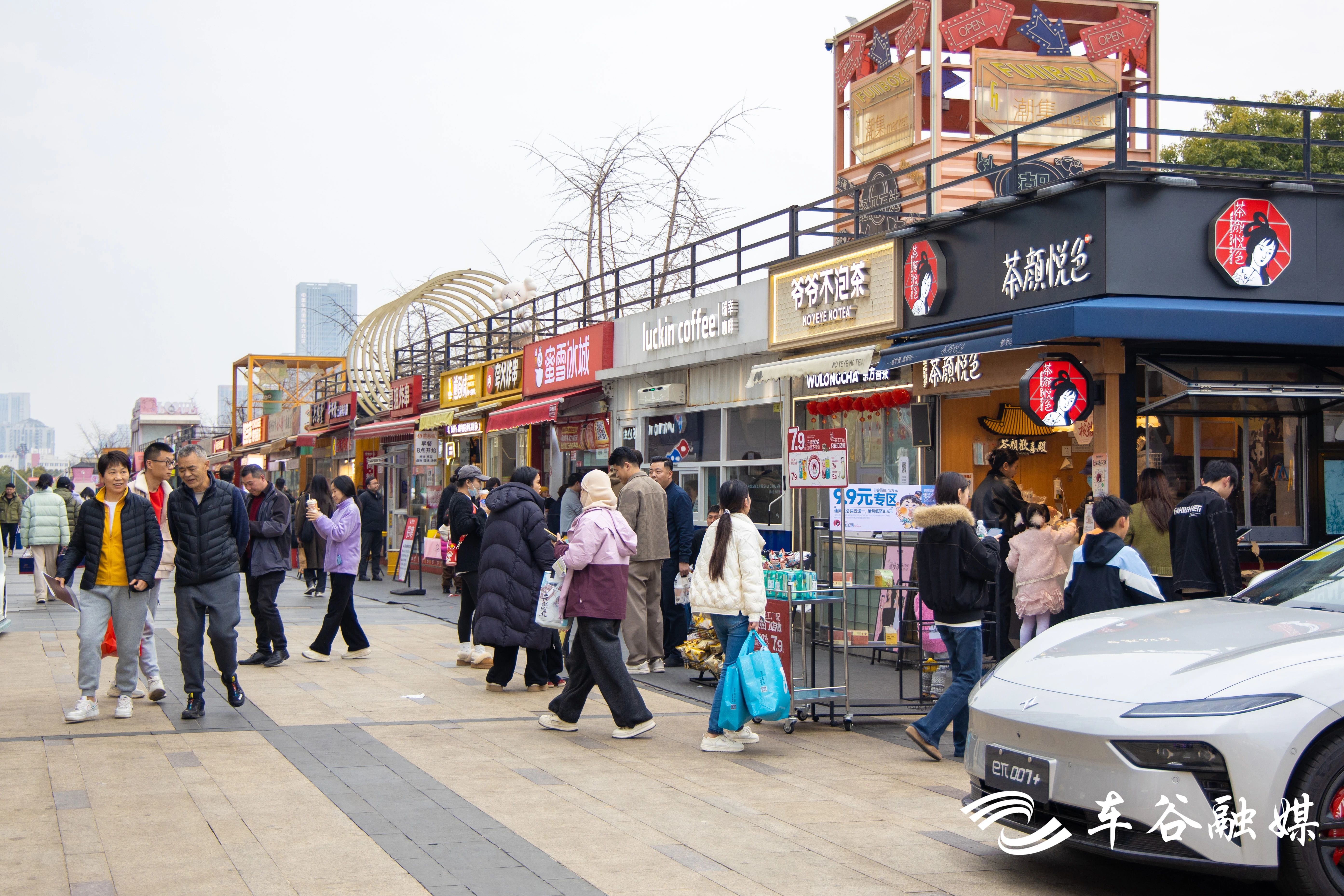 走进武汉杉杉奥特莱斯,刚停好车就感受到节日氛围:卖场大门的树上也系上了红围巾,市民走进商场前,先敲响铜锣迎接新年。中庭广场后面,金马迎春超级喜市里摊位次第铺开,鸡蛋仔、棉花糖、冰糖葫芦、章鱼小丸子等摊位前不少市民排队购买,成为市民逛街“补给站”。