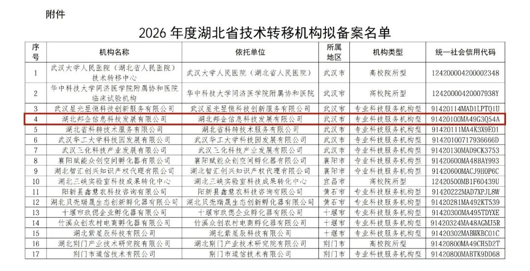 近日,湖北省科技厅公布2026年度湖北省技术转移机构拟备案名单,共有21家机构入选。其中,来自武汉经开区湖北邦企信息科技发展有限公司(以下简称“湖北邦企”)上榜,成为该区第3家省级技术转移机构。