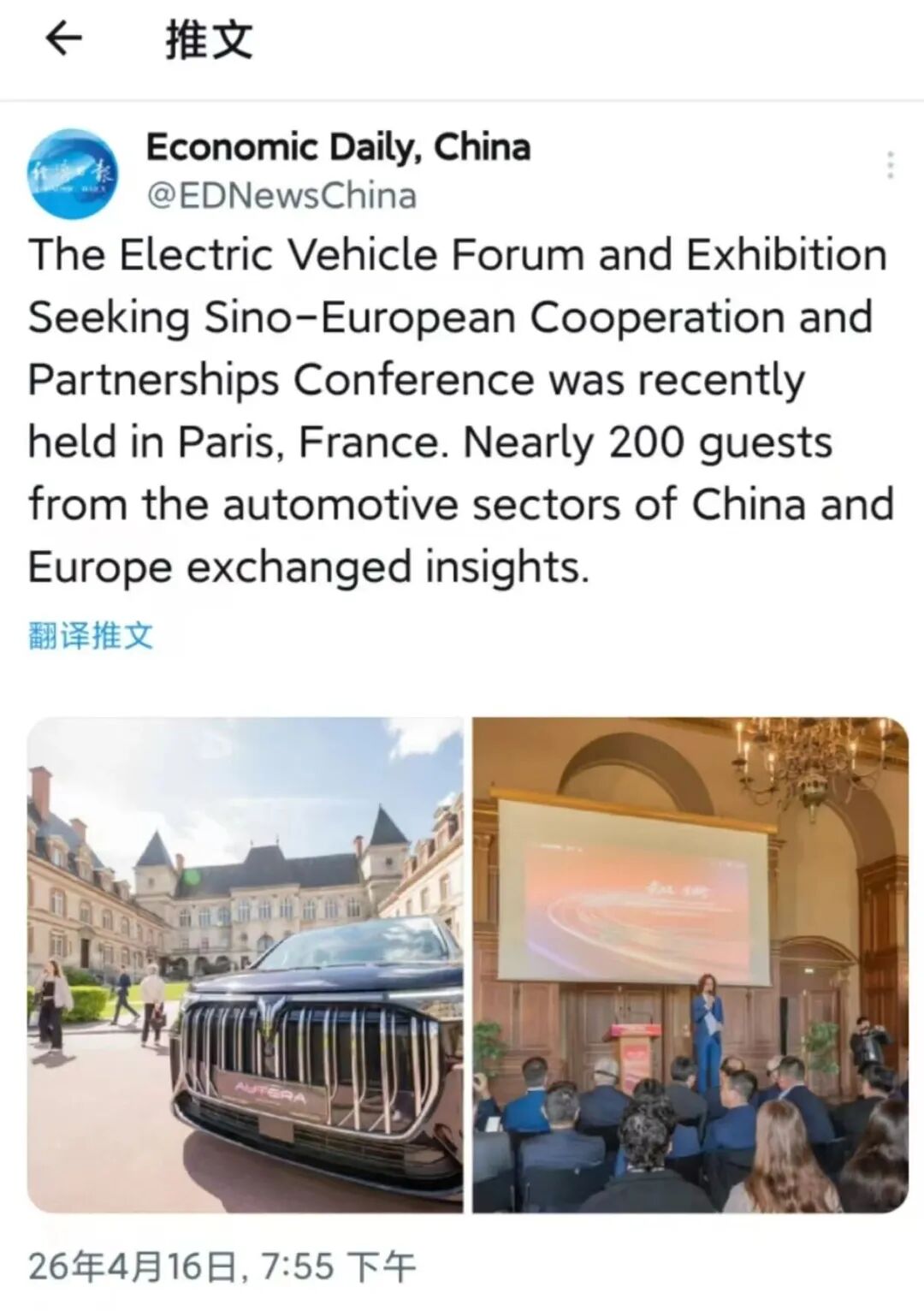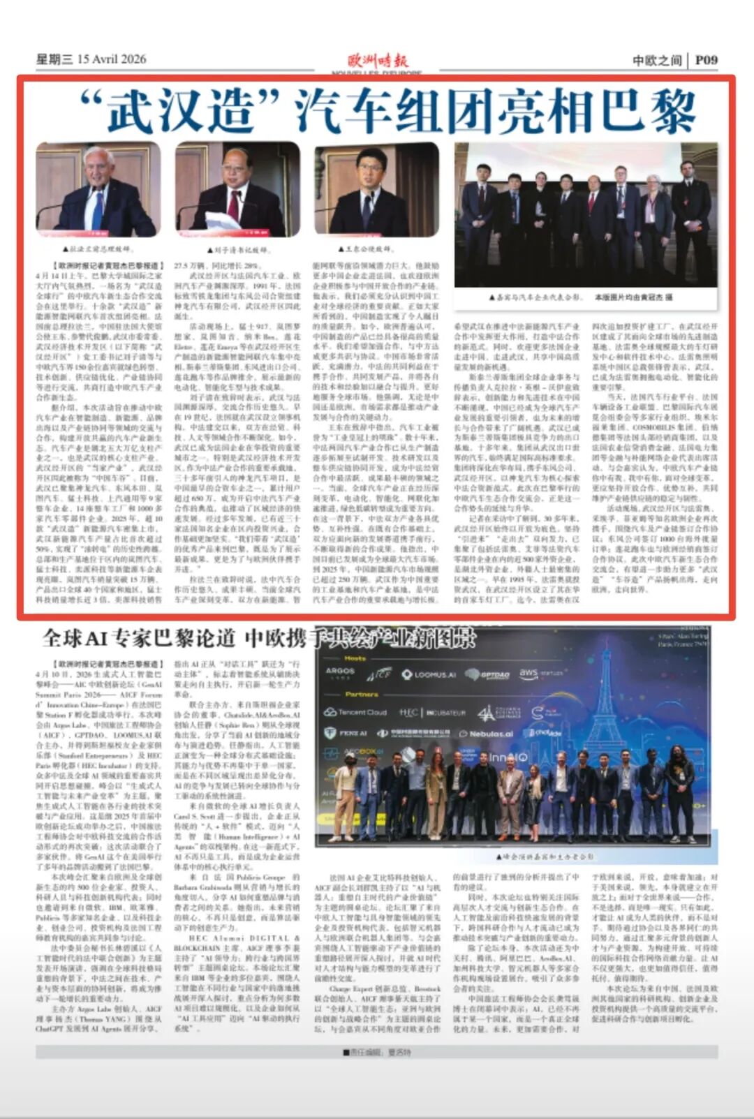 《欧洲时报》是欧洲最具影响力的华文日报之一,总部设于法国巴黎,读者覆盖全欧华侨华人、留学生及商务人士。当地时间4月15日,该报纸质版以半个版面聚焦此次活动,刊发题为《“武汉造”汽车组团亮相巴黎》的报道。文章指出,武汉经开区30多年来始终坚持开放发展底色,持续推进“引进来”与“走出去”双向发力,已集聚近500家外资企业,其中包括法雷奥、艾菲等法资汽车零部件企业,成为湖北省外资企业、外籍人士最为密集的区域之一。相信以此次中欧汽车新生态合作交流会为媒介,将会进一步助力更多“武汉造”“车谷造”产品扬帆出海,走向欧洲,走向世界。