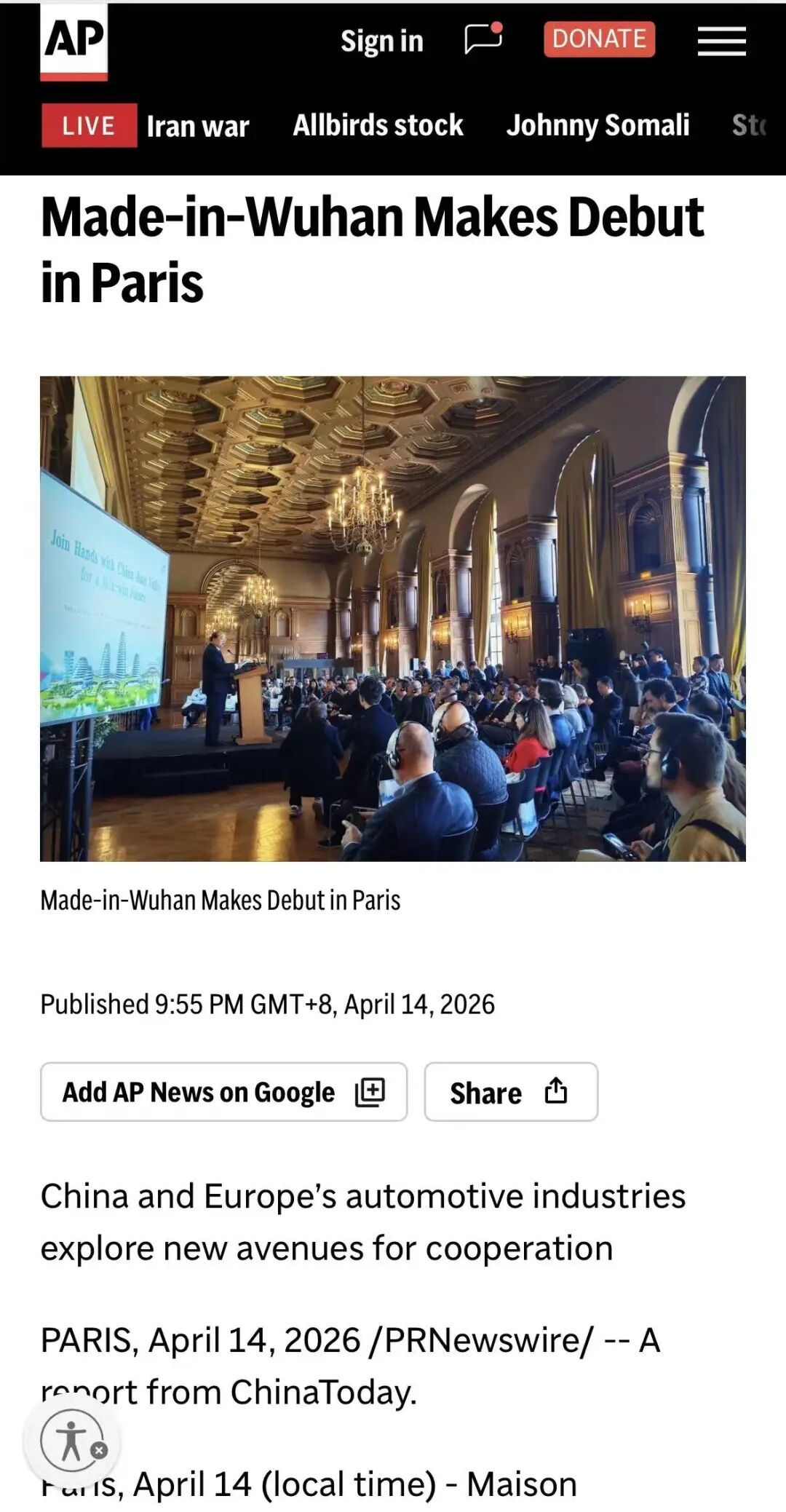 欧美主流媒体平台从多个角度聚焦本次活动。美联社以“武汉制造”在巴黎首次亮相为题,分析中欧汽车产业正在探寻合作新途径;法国最具权威性的经济财经类日报《回声报》认为,斯泰兰蒂斯正在重振其与东风汽车的合作关系;彭博社称,斯泰兰蒂斯集团正与东风汽车集团洽谈更深层次的合作,这项谈判若最终落地,将是中欧汽车合作模式从“单向输入”到“双向输出”的历史性转变。美通社对活动进行专题报道,晨星网等574家全球知名媒体平台也纷纷进行转载,进一步扩大了活动国际影响力。