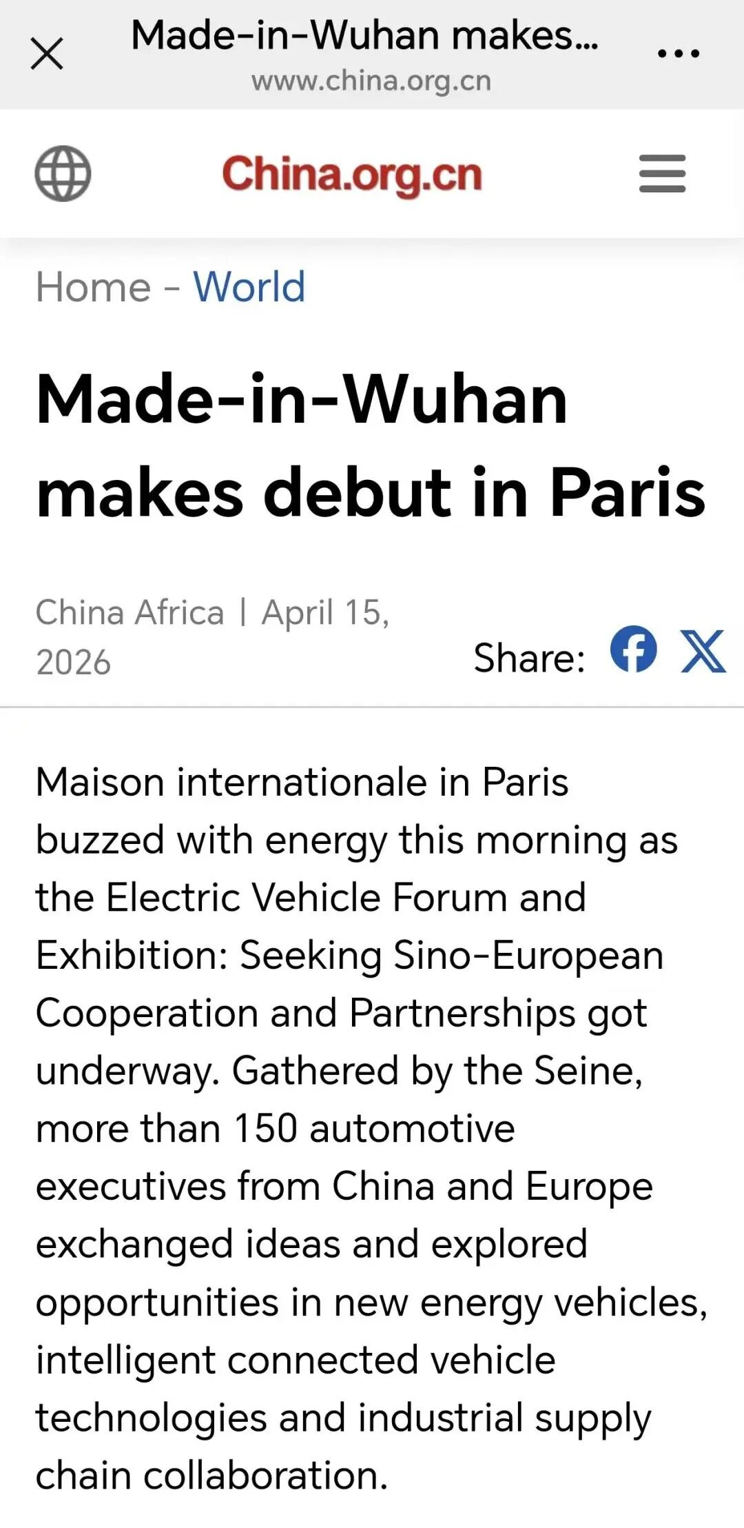 中国网的读者分布在世界200多个国家和地区,是十一个语种对外发布信息的“超级网络平台”,分别用英文和法文两种文字对外发布本次活动盛况。报道认为,选择巴黎作为展示窗口并非偶然,武汉与法国汽车工业的渊源可追溯至1991年,当年法国标致雪铁龙集团与东风公司合资组建神龙汽车有限公司,武汉经开区由此“因车而建、因车而兴”,被誉为“中国车谷”,新能源汽车产量占比去年首次超过50%,实现了从燃油车向电动化的历史性跨越。