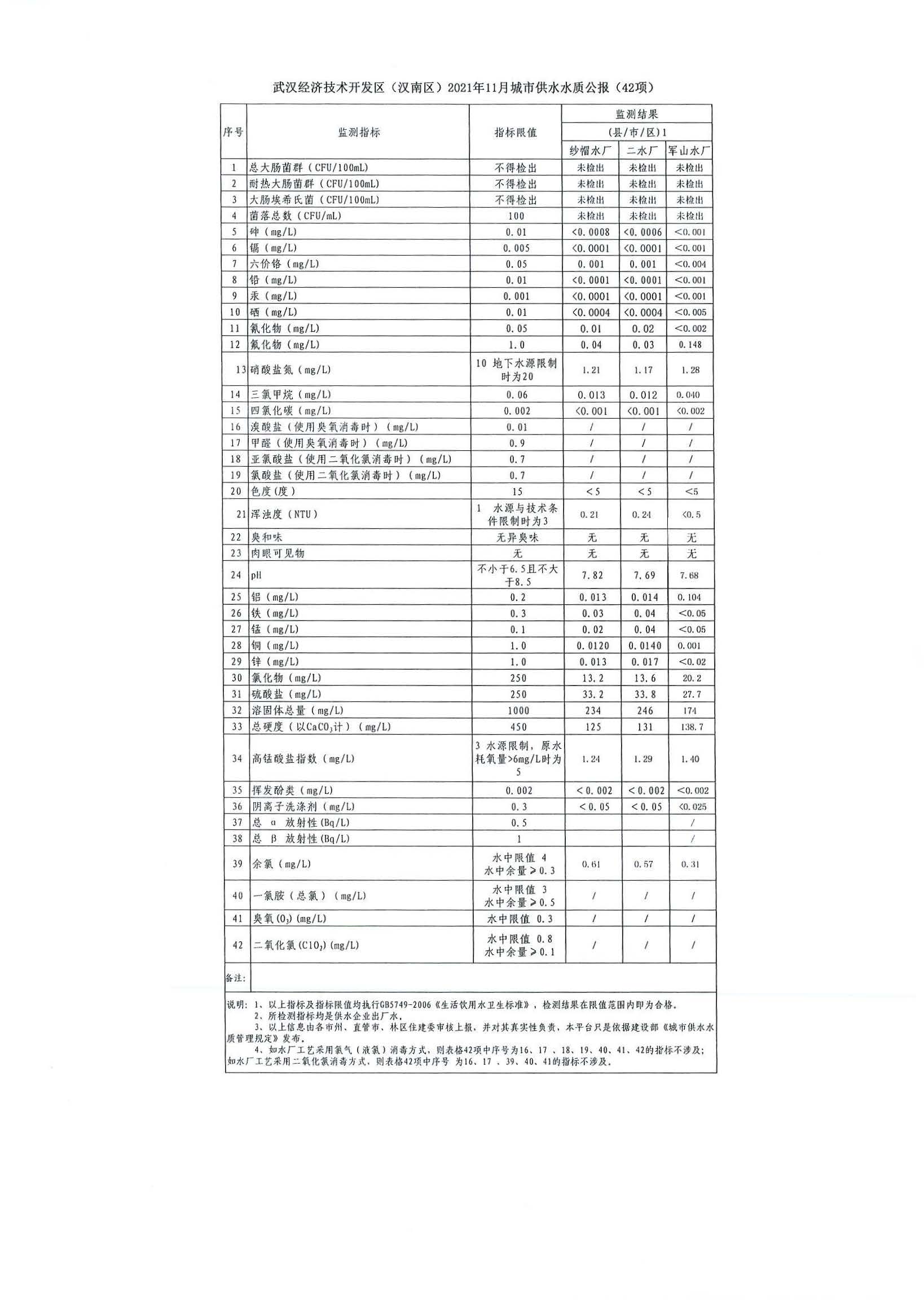 武汉经济技术开发区(汉南区)2021年11月城市供水水质公报(42项)