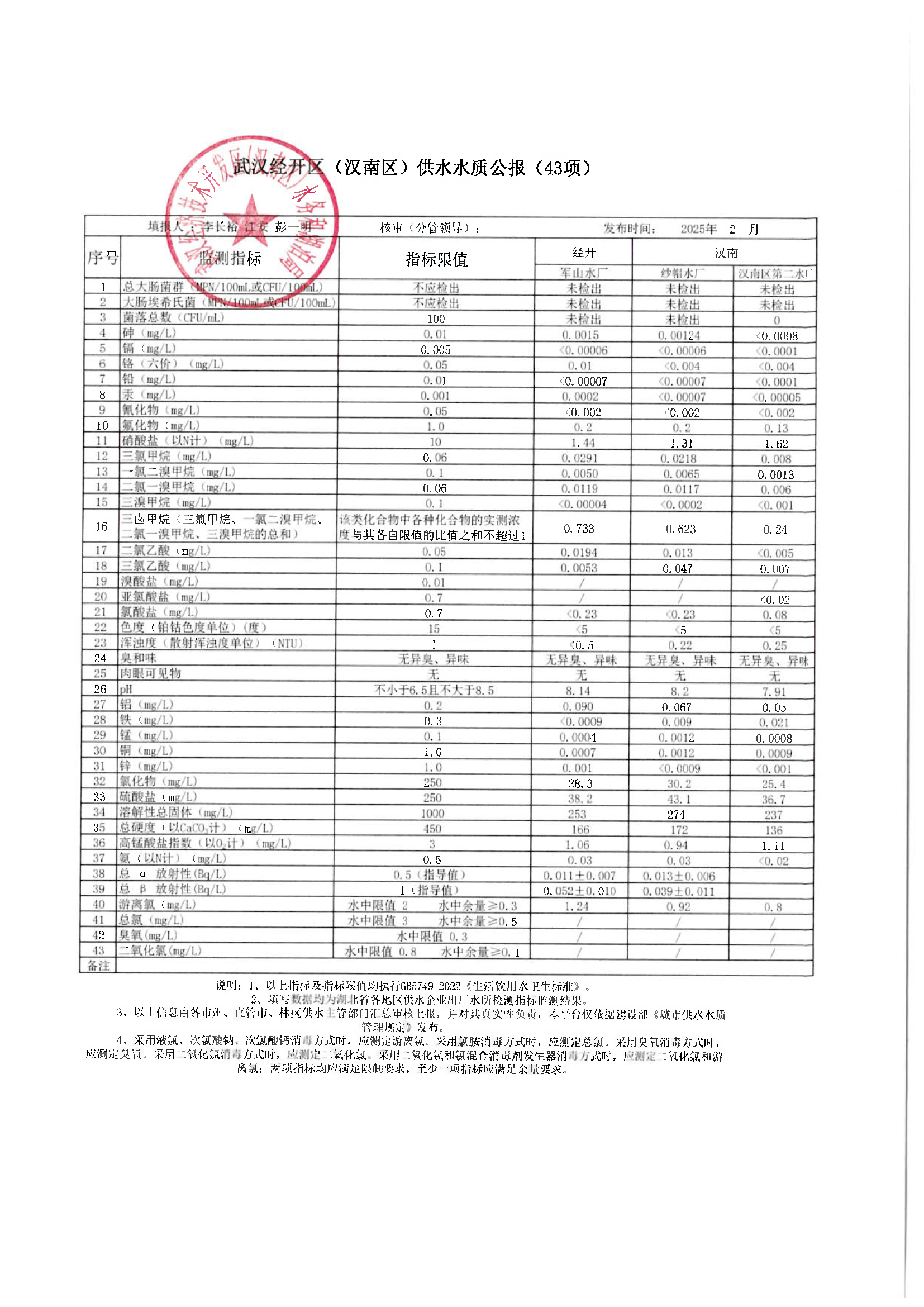 武汉经济技术开发区(汉南区)2025年2月城市供水水质公报