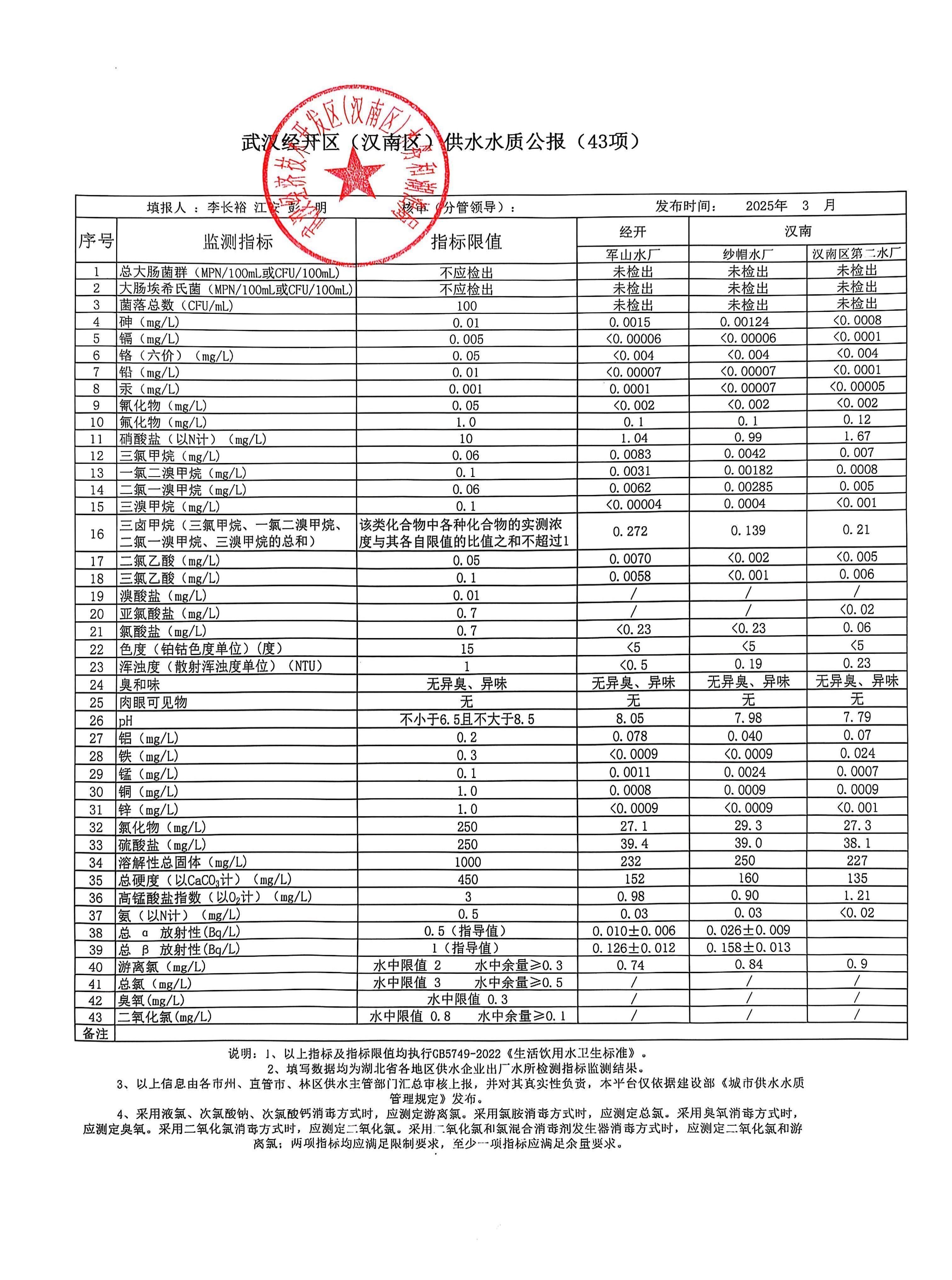武汉经济技术开发区(汉南区)2025年3月城市供水水质公报
