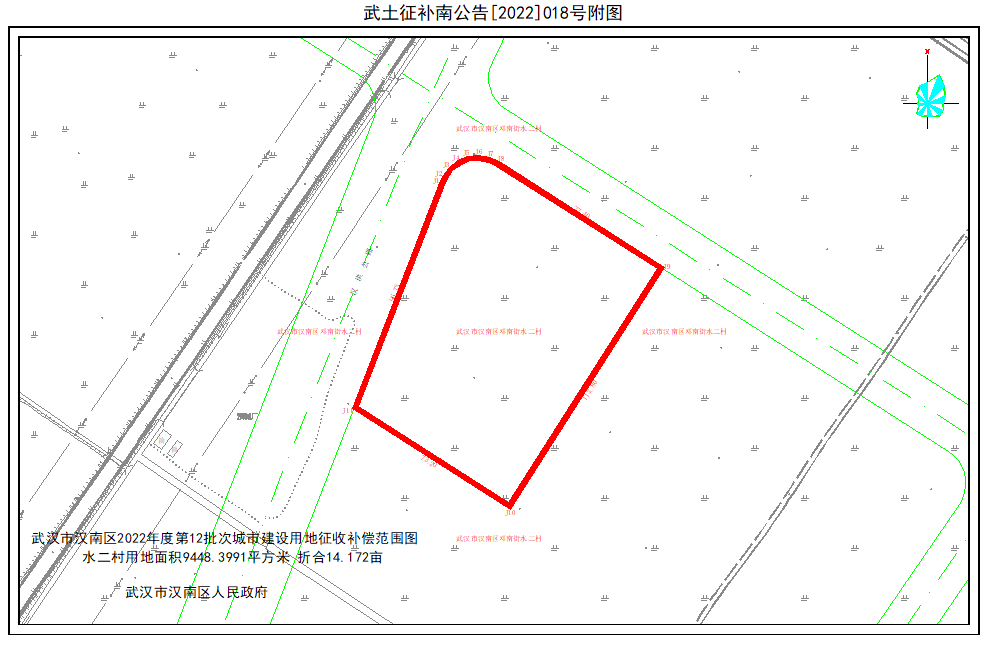 经土地现状调查和社会稳定风险评估,拟征收汉南区邓南街道水二村的集体土地0.9448公顷(其中:农用地0.9448公顷(含耕地0.9448),建设用地0公顷,未利用地0公顷,并于2022年6月14日发布了《土地征收预公告》(汉土告字[2022]018号)。