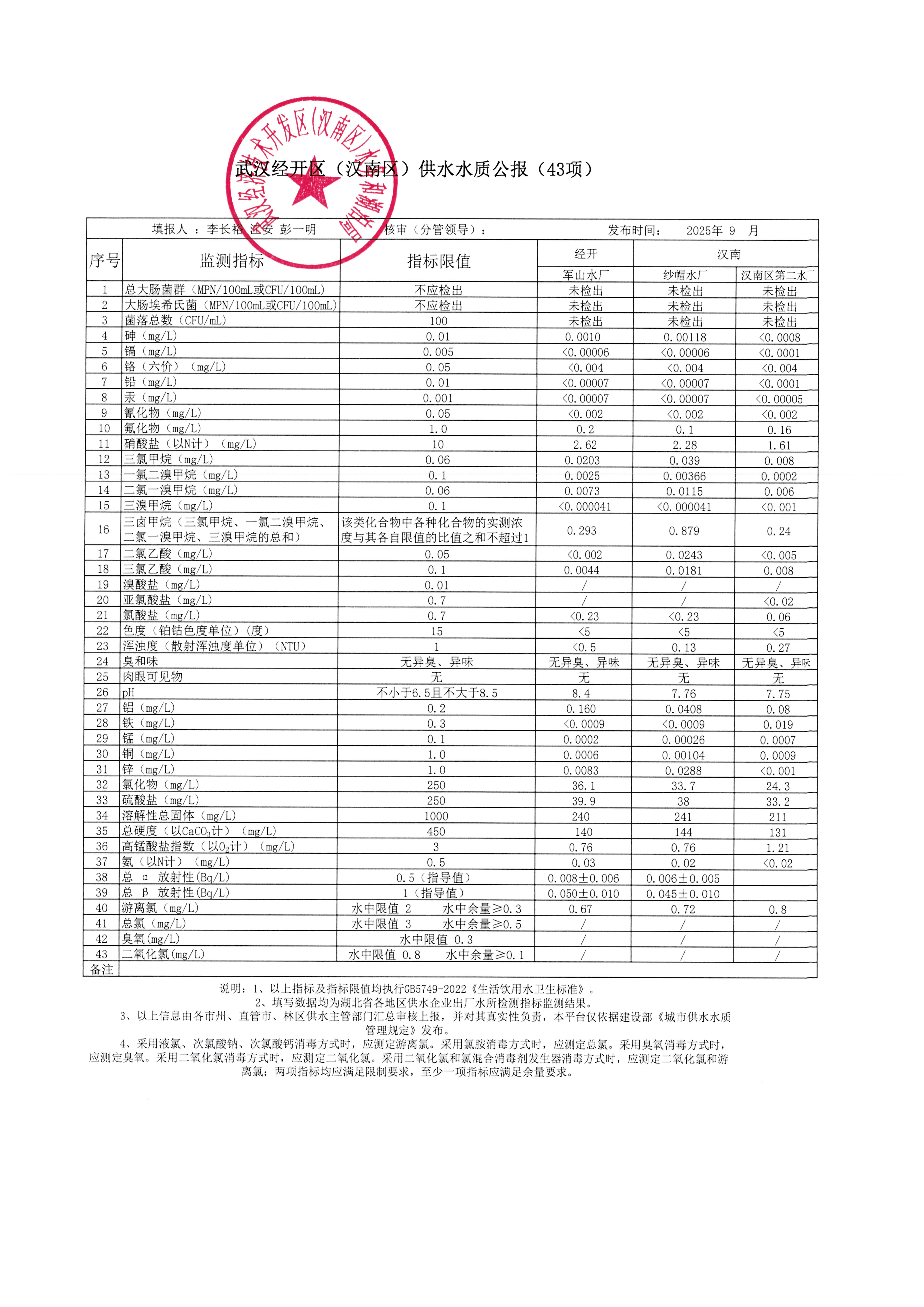 武汉经济技术开发区(汉南区)2025年9月城市供水水质公报