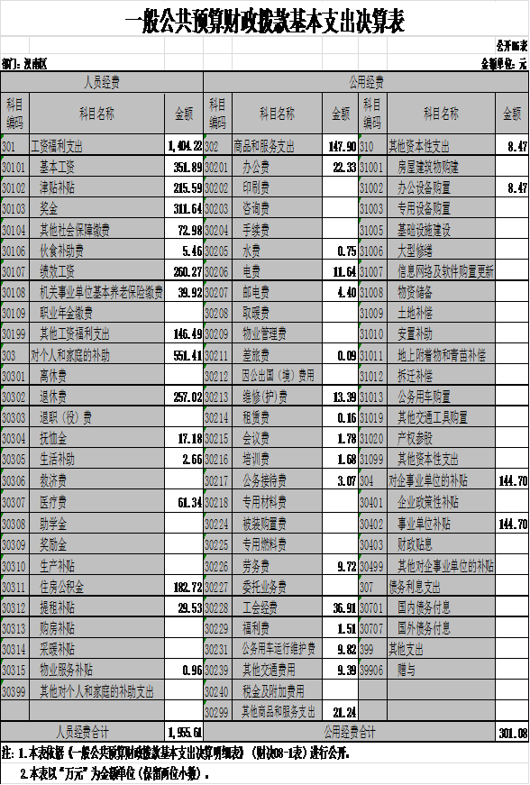 2016度一般公共预算财政拨款基本支出2256.69万元,其中,人员经费1955.61万元,主要包括:基本工资、津贴补贴、奖金、社会保障缴费、绩效工资、其他工资福利支出、退休费、抚恤金、生活补助、医疗费、奖励金、住房公积金、提租补贴、其他对个人和家庭的补助支出;公用经费301.08万元,主要包括:办公费、印刷费、咨询费、手续费、水费、电费、邮电费、物业管理费、差旅费、维修(护)费、租赁费、会议费、培训费、公务接待费、劳务费、委托业务费、工会经费、福利费、公务用车运行维护费、其他交通费用、其他商品和服务支出、办公设备购置、其他基本建设和资本性支出。