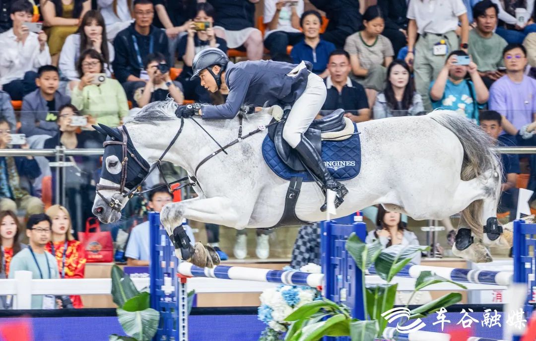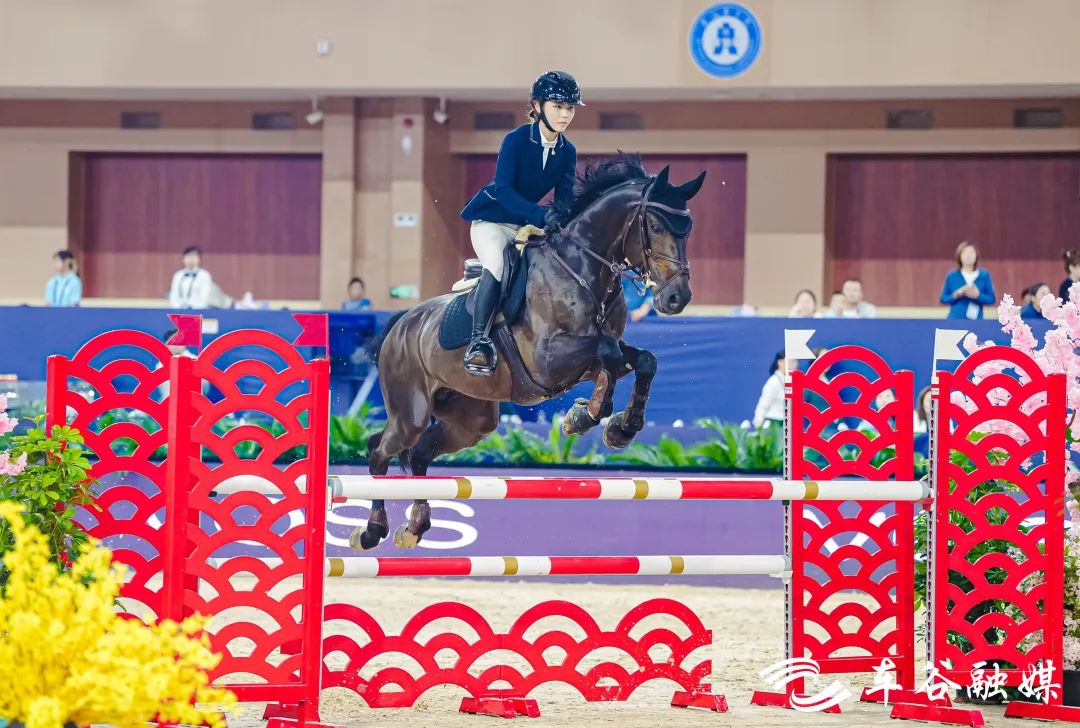 赛场上,骑手们与马匹配合默契,在高速行进中精准跨越障碍。在开幕式后进行的1.40米世界杯资格赛上,14岁的年轻选手孙瑞睿策骑马匹“布丁”凭借着一轮动力十足、流畅自如的跳跃,以零罚分、65.77秒的好成绩斩获冠军。