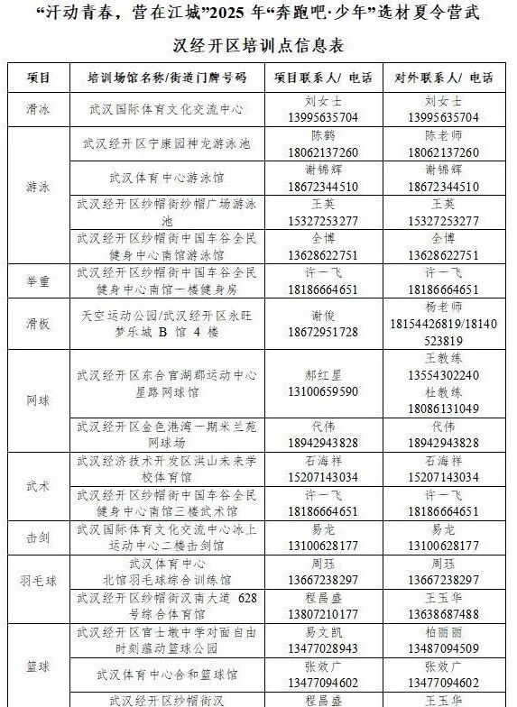 武汉经开区文旅局相关负责人介绍,选材夏令营技能培训活动在暑期面向全市6岁至12岁学生开展体育运动技能培训。活动分为为全市适龄学生提供技能培训、组织专项选材测试、组织开展市级优苗训练营三个阶段进行。
