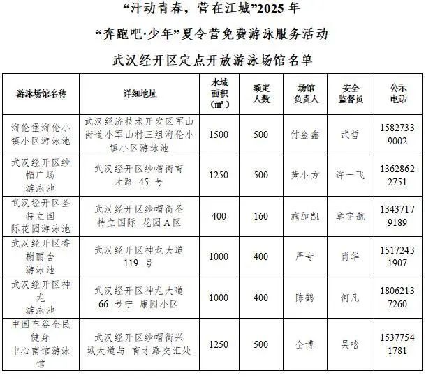 此外,2025年武汉市夏令营免费游泳活动于7月12日至7月31日在全市范围内开展,共20天,义务教育阶段的中小学生在指定游泳池(馆)可免费游泳。