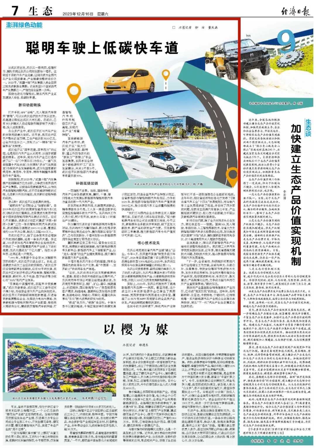 12月16日,经济日报在第7版刊发新闻《聪明车驶上低碳快车道》,报道湖北汽车产业绿色低碳转型,其中重点聚焦武汉经开区从传统汽车到智能网联汽车新旧动能转换,补链延链强链、核心技术攻关等方面着手,持续推动汽车产业“转向换道”的生动实践。