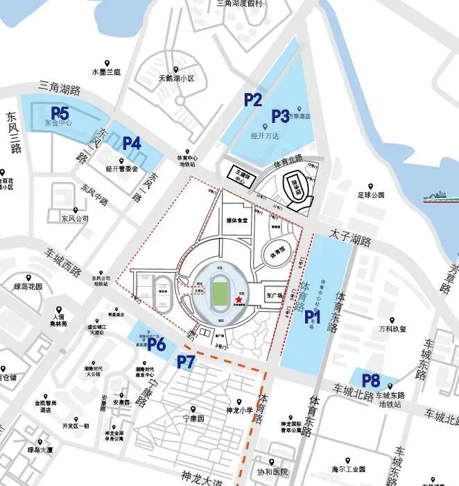 3.乘公交至东风大道三角湖路站,沿东风大道——太子湖路——体育路步行至体育中心4、5号门