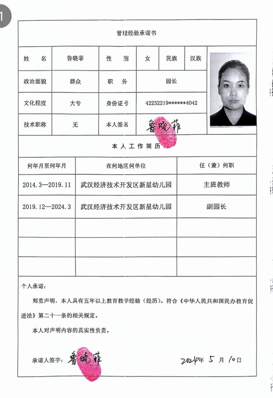 根据《中华人民共和国民办教育促进法》第二十一条之规定:学校理事会或者董事会由举办者或者其代表、校长、教职工代表等人员组成。其中三分之一以上的理事或者董事应当具有五年以上教育教学经验。因武汉经济技术开发区绚丽七色光幼儿园需办理校长变更,现将董(理)事会成员鲁晓菲(身份证号:42232219******4042)、校长鲁晓菲(身份证号:42232219******4042)的个人教育教学经验简历进行公示。